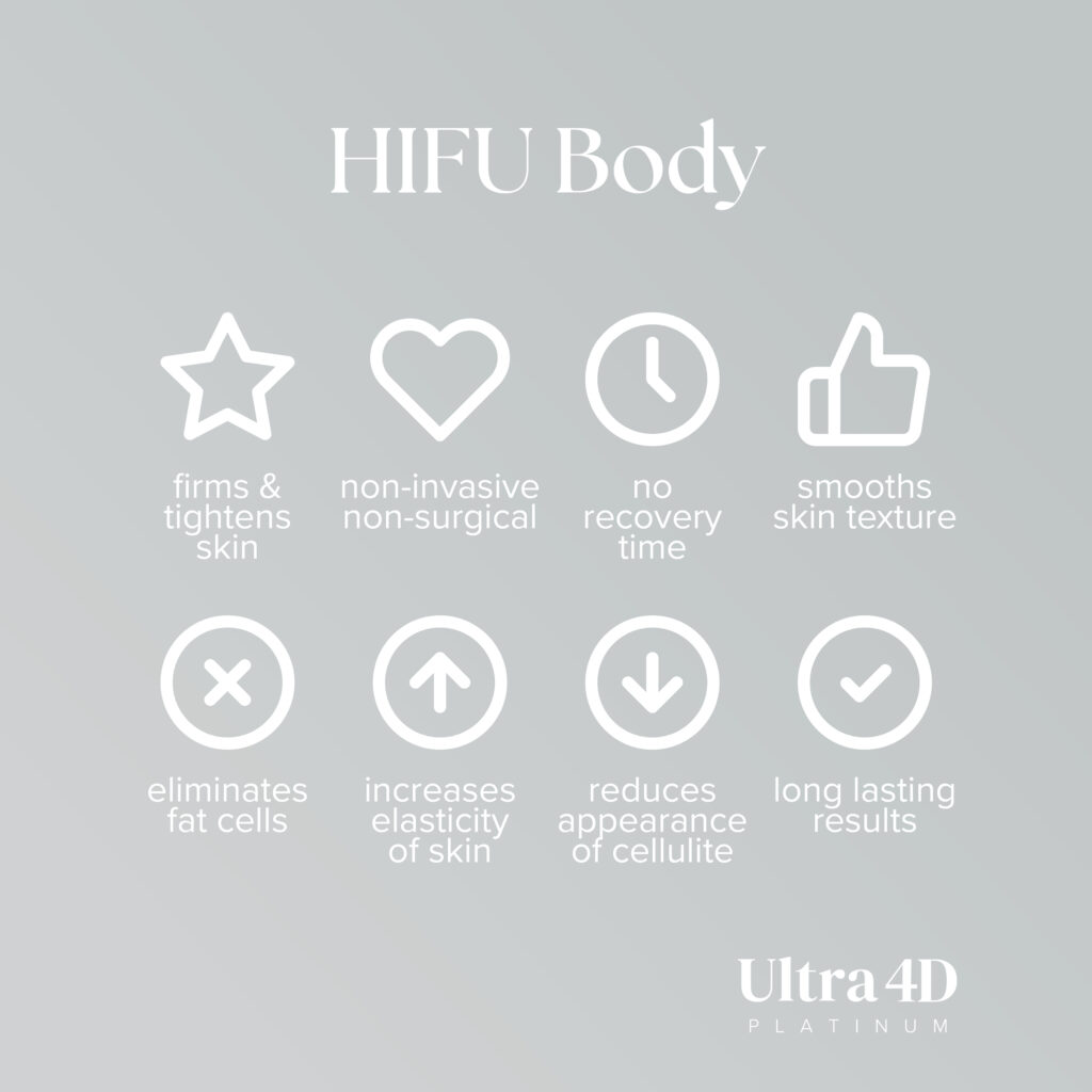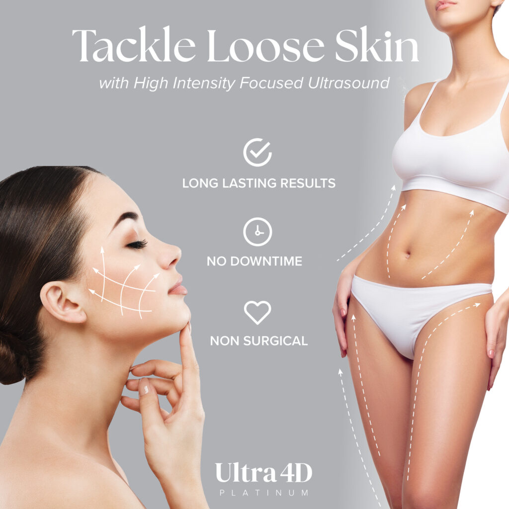 HIFU stands for ‘High-Intensity Focused Ultrasound’. HIFU is a non-invasive aesthetic procedure which uses focused ultrasound energy waves to penetrate all 3 layers of the skin (Epidermis, Dermis & Hypodermis/ subcutaneous tissue). The outcome of these waves is to stimulate collagen production & remodelling, thus causing tissue regeneration, tightening and rejuvenation.